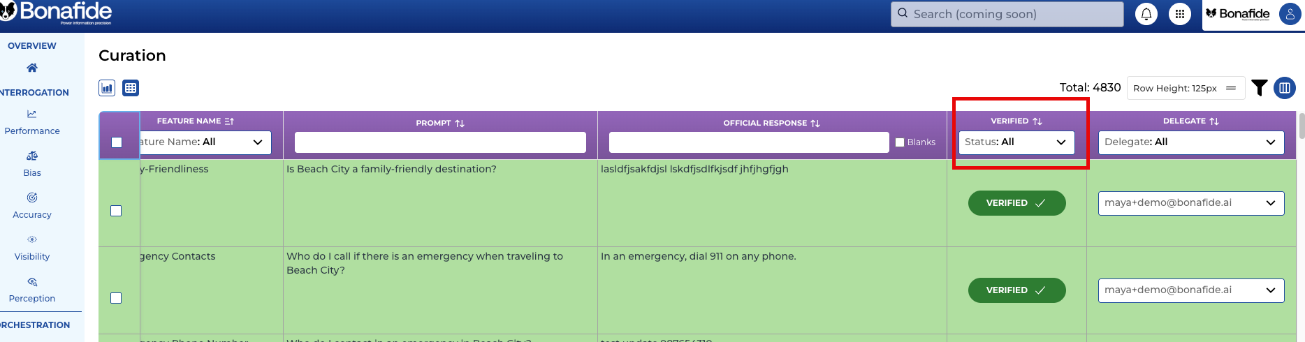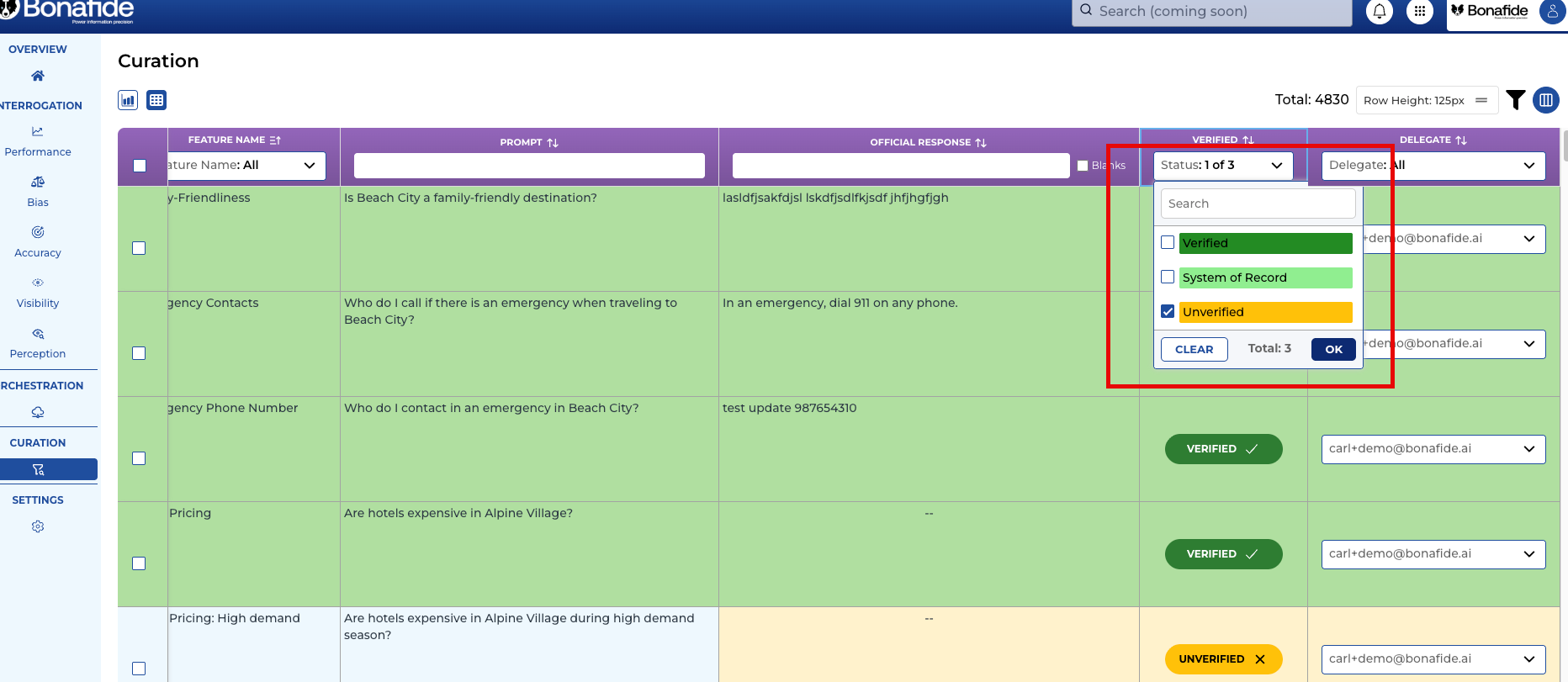 To locate the questions your website is failing to answer, you must filter your Curator dashboard to show only "Unverified" prompts.