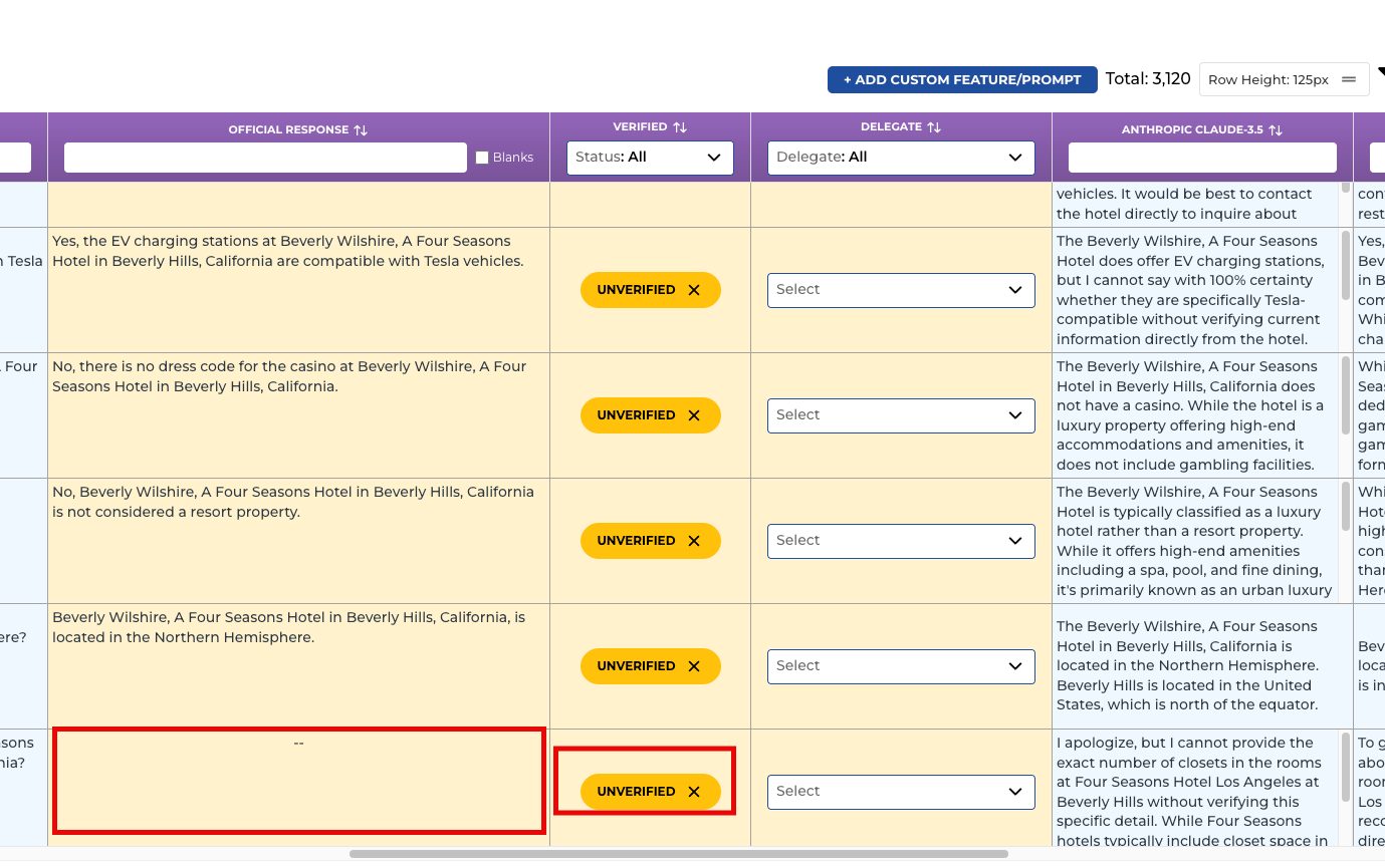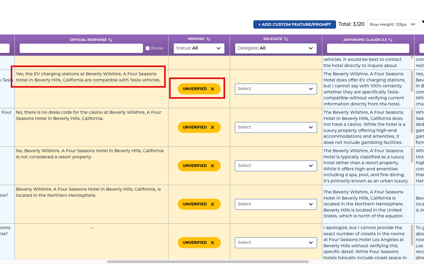 3. Verify: Once the answer perfectly reflects your brand's truth, click the "Unverified" status button to change it to "Verified" (the row will turn dark green).