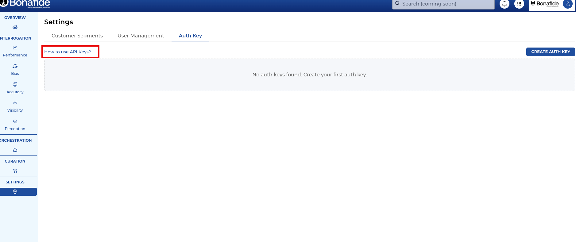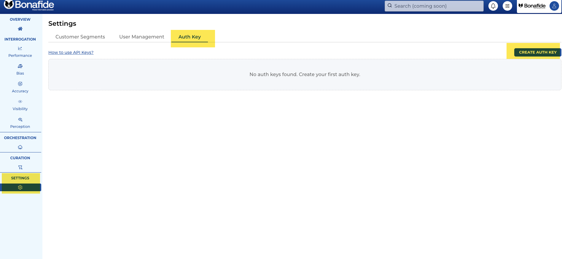 To find the API Key feature, navigate to the Settings module in the Bonafide platform. From there, select the very last tab labeled Auth key.