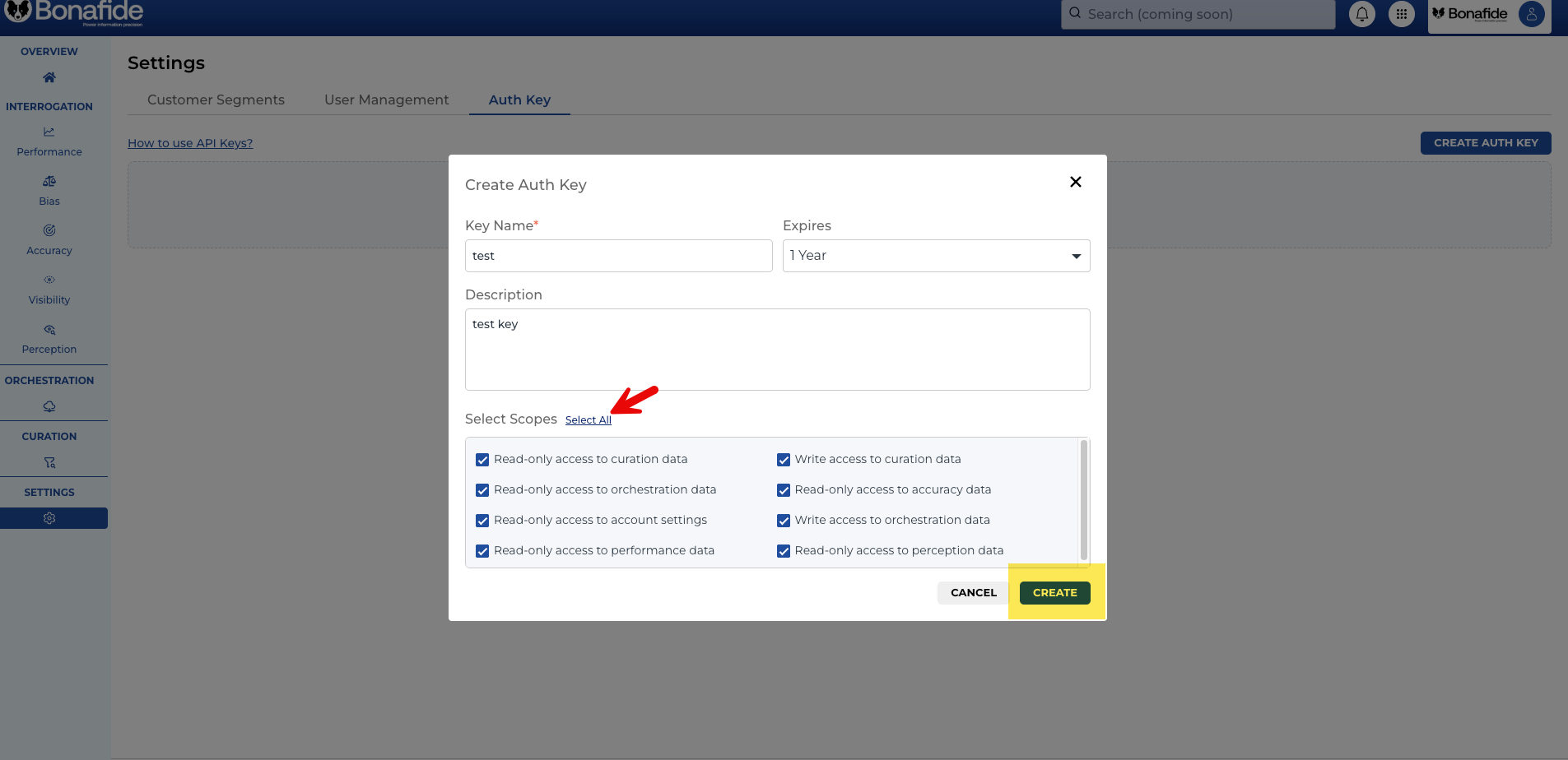 The Bonafide API Key feature allows users to connect external applications or an MCP server directly to the Bonafide platform to pull data without needing to log into the web application. Through this feature, users can generate keys to access various data endpoints, including Curation, Orchestration, Perception, Performance, Account, and Accuracy data.