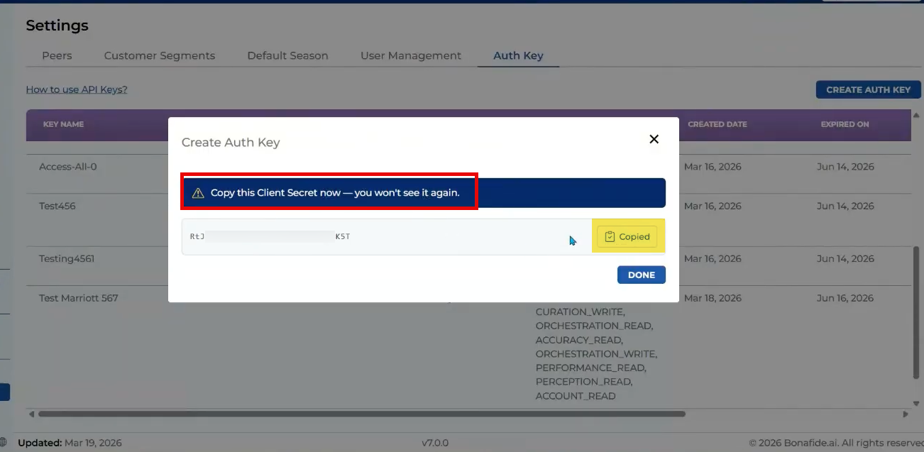 Immediately after clicking "Create," a screen will display the newly generated authentication key. This is a critical step: The screen will display a warning noting, "copy this client secret now you won't see it again".