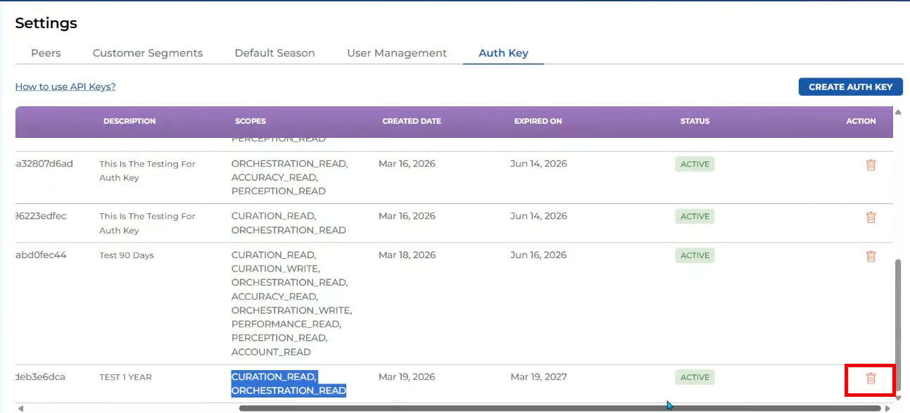 If a user needs to delete a key or free up space to stay under the 10-key limit, they can easily revoke access. Simply navigate to the Auth key dashboard, locate the specific key record, and click the delete icon to instantly revoke it.