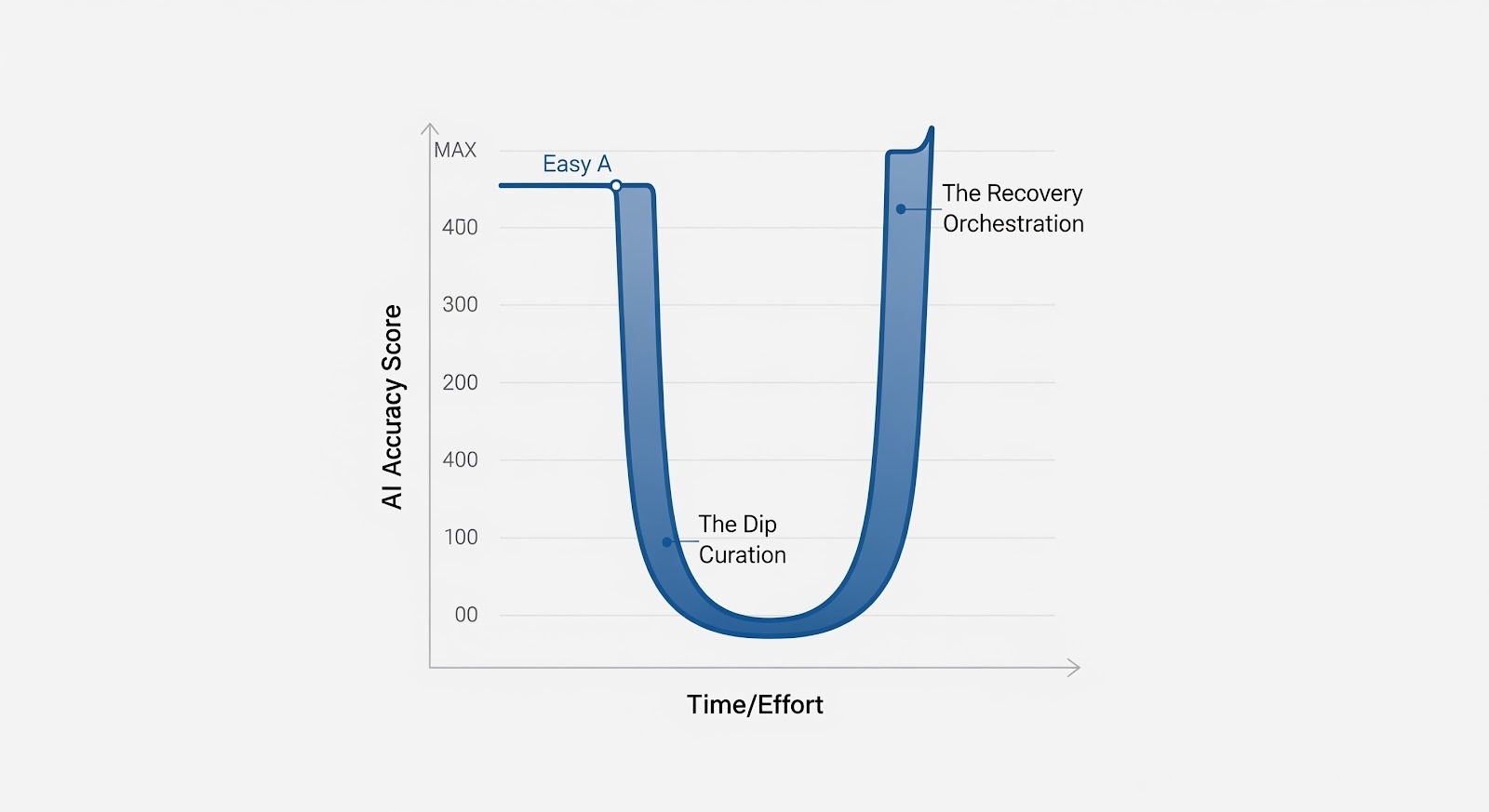 Suddenly, the AI starts getting the hard questions right. Your score corrects and trends upward completing the "U-Shape".